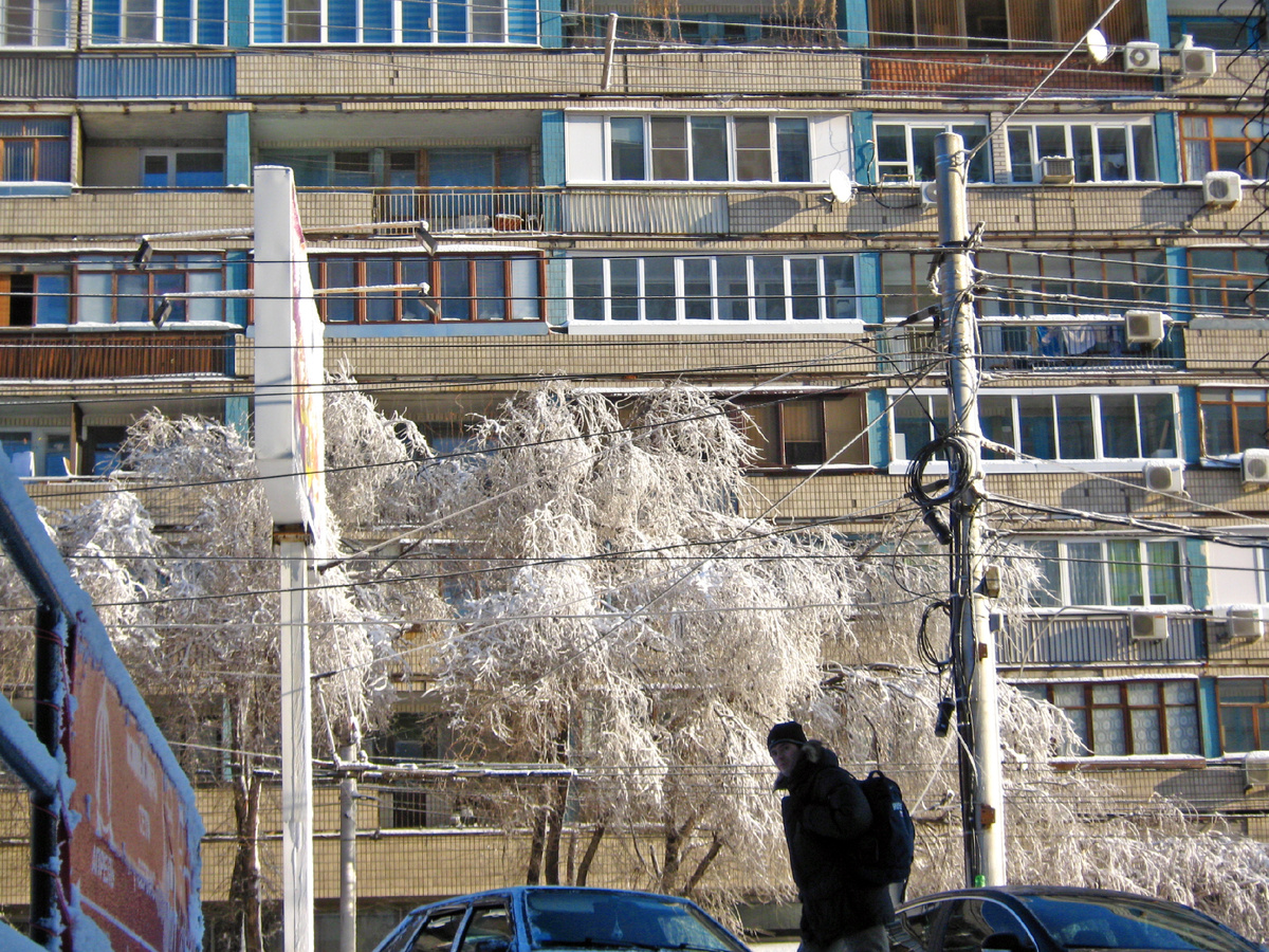 Деревья, ветки которых потяжелели от налипшего на них льда и снега, больше похожи на веники. Это фото сделано 22 декабря 2009 года возле офисного здания Premier Building.