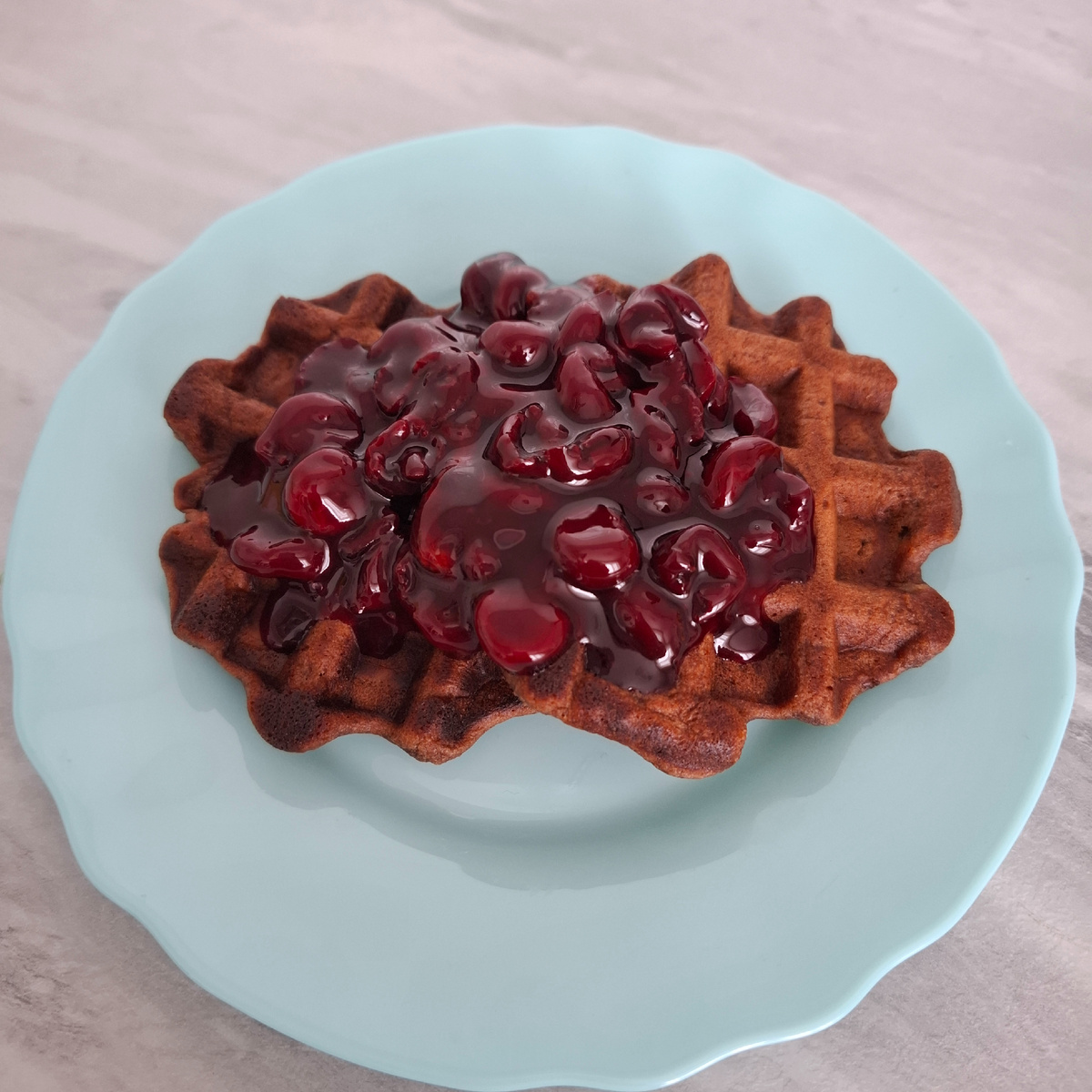 Вафли на завтрак, это особое наслаждение. Предлагаю рецепт шоколадно-творожных вафель с вишневым соусом, которые точно вам понравятся. (На 4 человек) 400 гр. творога 3 яйца 1 ст.л. сахара (если любите по слаще, можно 2-3 добавить) 3 ст.л. рисовой муки (можно обычную) 2 ст.л. какао 60 гр. молочного шоколада 40 мл. молока 10 гр. разрыхлителя Шоколад растапливаем удобным способом и перебиваем все ингридиенты погружным блендером до однородной массы. Выпекаем в вафельнице (у меня мультипекарь) до готовности. 200гр. вишни 2 ст.л. сахара 5 гр. кукурузного крахмала Размораживаем вишню, сок от нее сливаем в бокал и добавляем крахмал, тщательно перемешиваем. В сотейнике объединям вишню, сахар и вишневый сок с крахмалом перемешиваем и варим до загустения. Приятного аппетита!