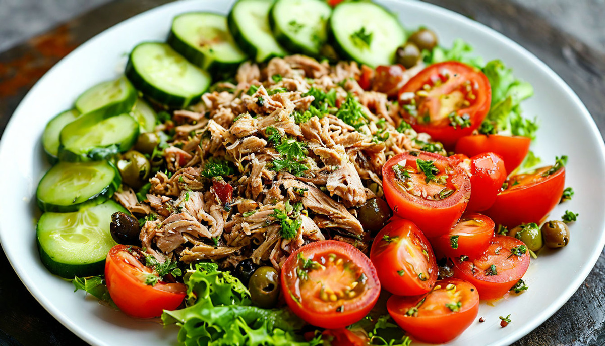 Консервированный тунец 280 г Помидоры черри 100 г Огурец свежий 1 штука Листовой салат 1 пучок Оливки или маслины без косточек 50 г Лимонный сок 30 мл Дижонская горчица 2 ч. ложки Оливковое масло 45 мл Соль по вкусу Перец чёрный молотый по вкусу