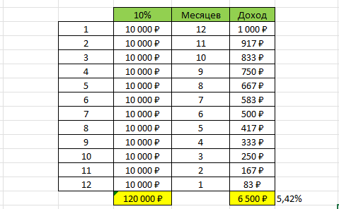 А теперь давайте немного усложним наш пример. Давайте представим, что изначально у нас не было 120 000 рублей. А мы вносим на наш вклад с той же 10%-ой доходностью каждый месяц по 10 000 рублей. Первая сумма денег пролежит на счете весь год, и принесет 1 000 рублей доходности. Вторая сумма, пролежит уже всего 11 месяцев. И принесет уже 917 рублей доходности. И так далее.