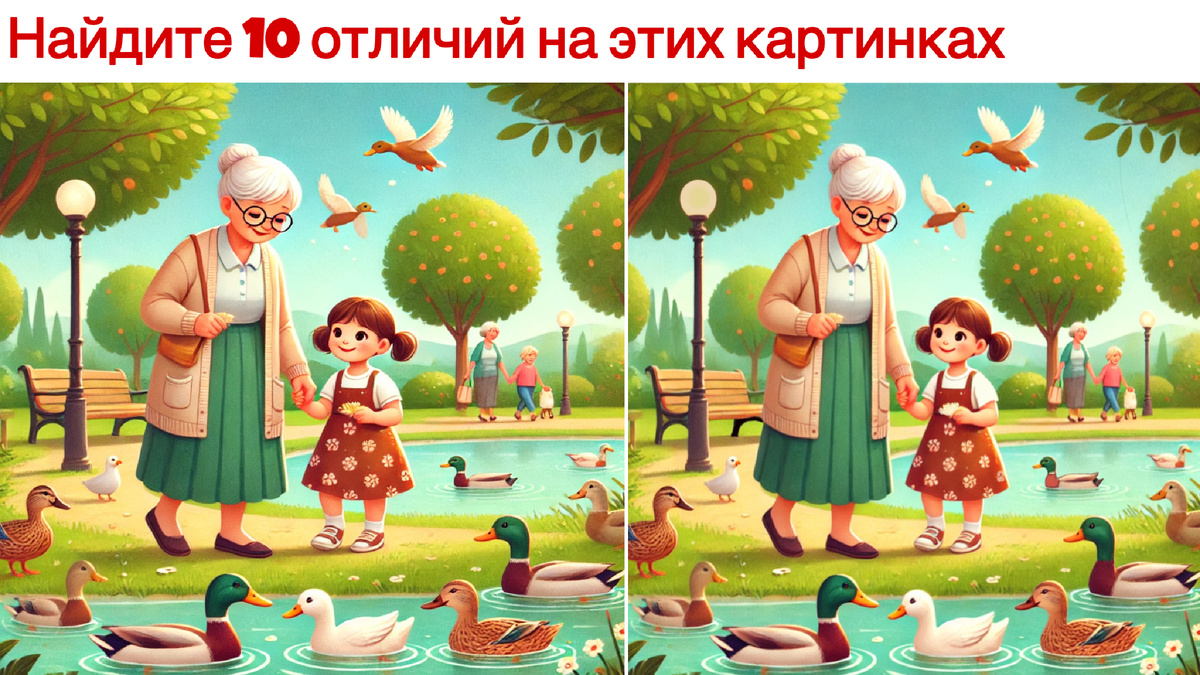Как приятно проводить время с близкими в парке! Тёплый день, чистый воздух, пруд с утками и зелёные деревья вокруг. Бабушка с внучкой неспешно гуляют, любуясь природой и угощая уточек хлебом. Давайте сыграем в увлекательную игру – попробуйте найти 10 отличий. Готовы проверить свою внимательность?