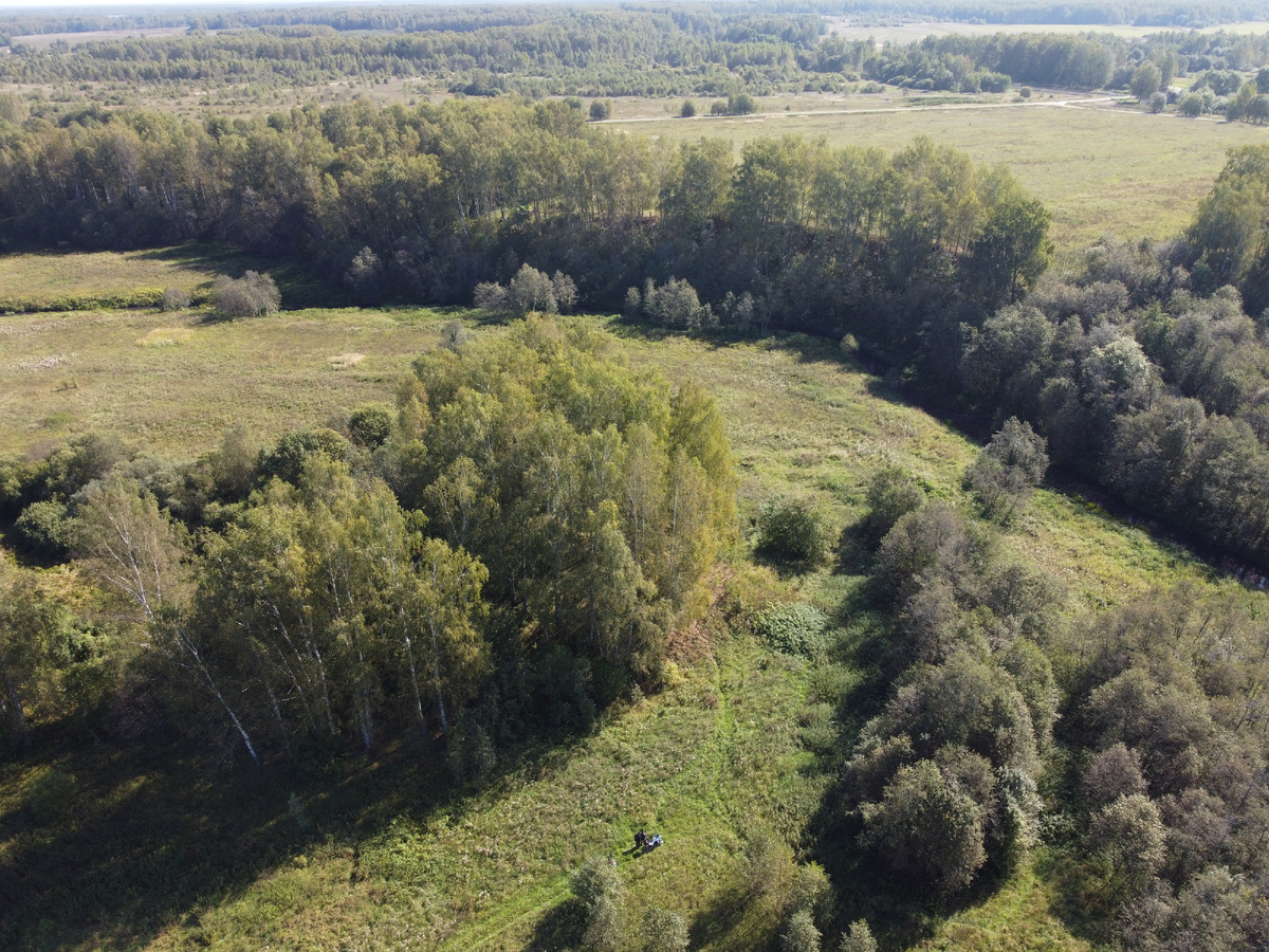 С вершины кургана открывается вид на полянку, которая примыкает к реке Шача. На фото реку не видно из-за растительности.