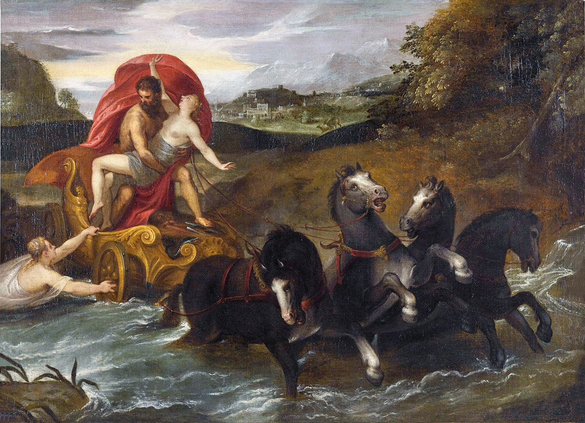 На этой картине последователя Кристофа Шварца (1545–1592) изображена ранняя часть истории Персефоны (Прозерпины), когда её дядя Аид (Плутон) силой затаскивает девушку в свою колесницу и увозит, чтобы она стала царицей в подземном мире. При этом он игнорирует мольбы водной нимфы Кианы, которая видит, что происходит, и пытается остановить бога. Дочь Зевса (Юпитера) и Деметры (Цереры), Персефона, была похищена Аидом. Узнавшая об этом Деметра, богиня земли, решила не выполнять свои обязанности, пока ей не вернут дочь. Но, к сожалению, Персефона съела гранатовое зернышко, находясь в подземном царстве, и привязало её к Аиду. Зевс согласился на компромисс: Персефона проводит четыре (некоторые источники говорят, шесть) месяцев на земле со своей матерью, а остаток года — в подземном мире. Персефона, известная ранее как Кора, «дева», была чиста и прекрасна. Но став царицей подземного мира, была обязана помогать мужу — никто не мог умереть, пока она не срежет волос с головы. Согласно римской в