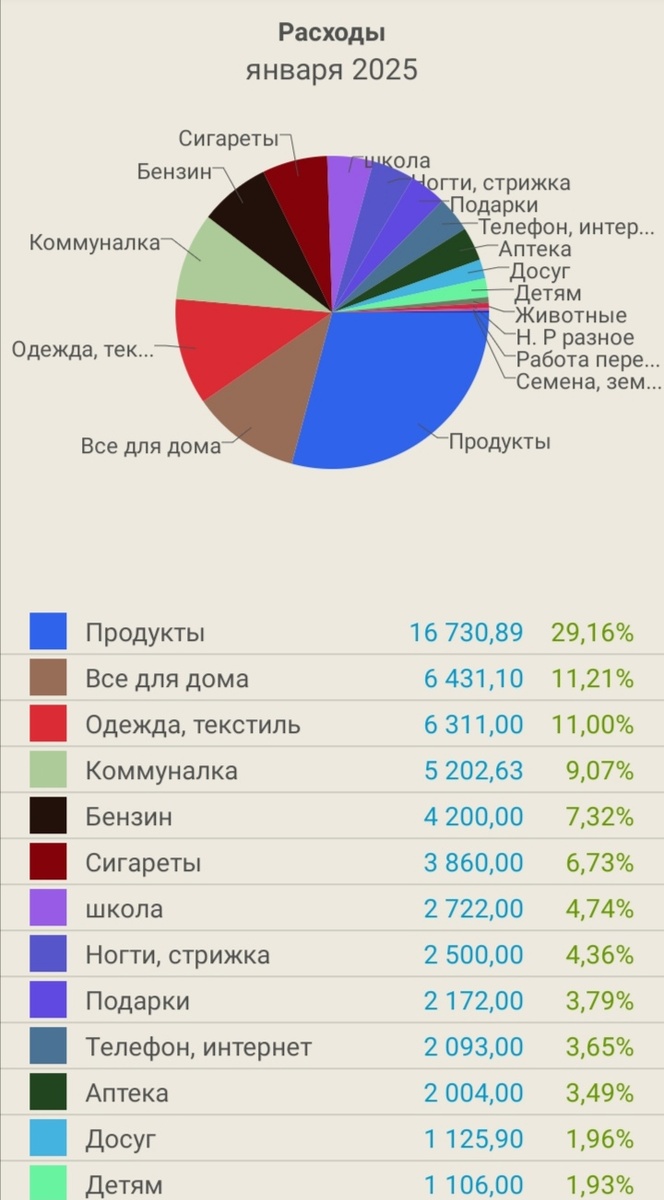 Подвела итог первого месяца этого года. Учимся жить экономнее. Вроде бы получается. За месяц потрачено 57 368. (2024 г. - 55 193 р. ) В заначку отложить не получилось, а вот три тысячи взять пришлось на покупку нового роутера. С другой стороны при доходе за этот месяц 14 220, это нормально. Основной доход мы получили в декабре, но я распределила часть на январь. Хватило с натяжкой. На продукты потрачено 16 730 р., были экономные эксперименты, и срывы были. В прошлом году на продукты было потрачено: - 16 190 р., с учётом повышения цен, думаю не так и плохо. На этой неделе, последней перед зарплатой, и финансово самой тяжёлой, на продукты ушло 950 р. Спасает наличие своих овощей. Кроме лука ничего из овощей не покупаю. Лишних, не запланированных расходов практически не было, не считая роутера и у двоих детей полетела зимняя обувь. Распределение доходов и предстоящих расходов. В понедельник и вторник будет выплата на детей и расчёт наш с мужем. Я уже приблизительно на