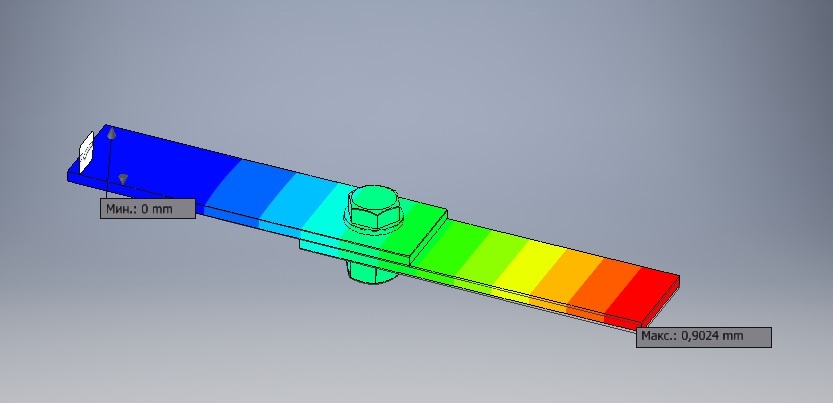 Проведено моделирование нагрузки в 1839 Н (187,53 кг) до текучести металла 250 мПа. Левая пластина закреплёна, к правой приложена нагрузка. Ответ: болтовое соединение М8 на срез выдержит 187, 53 кг., при превышении нагрузки, разрушение начнётся по резьбовой части.