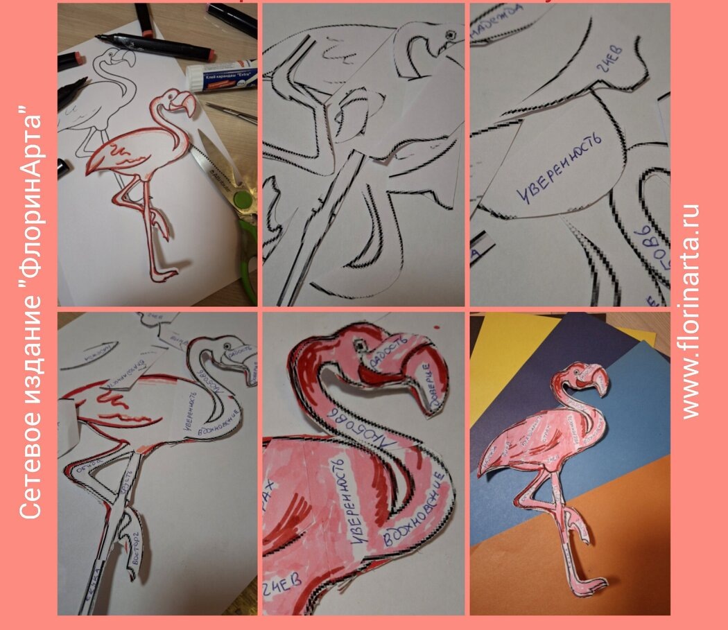 Цель: изучение эмоционально-личностной сферы. Возраст: дети с 6-7 лет; взрослый. Материалы: шаблон розового фламинго из бумаги; картон белого цвета (1 лист); офисная бумага белого цвета (3 листа); шариковая ручка, фломастеры/карандаши розового цвета; клей; ножницы. Ход работы