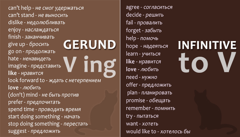 Глаголы, после которых нужно использовать Герундий (Ving) или Инфинитив (to V).