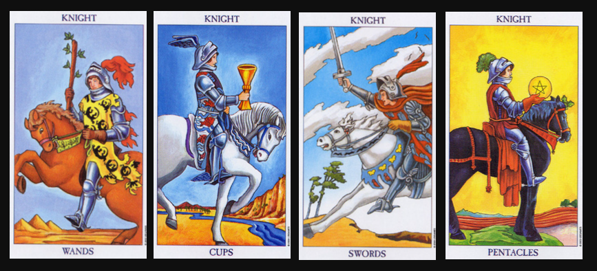 Рыцари - самые быстрые Придворные карты, все остальные (Пажи, Короли и Королевы) стоят или сидят, Рыцарь всегда в движении. Он - импульс, движущая сила, это и понятно - каждый Рыцарь стремится проявить себя, он делает, достигает, потому он всегда в пути, в деле, в движении.