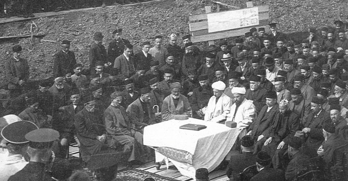 М. Ф. Соколов (второй справа) с семьей и его брат С. Соколов (второй слева) 1913 на закладке Соборной мечети в Нижнем Новгороде