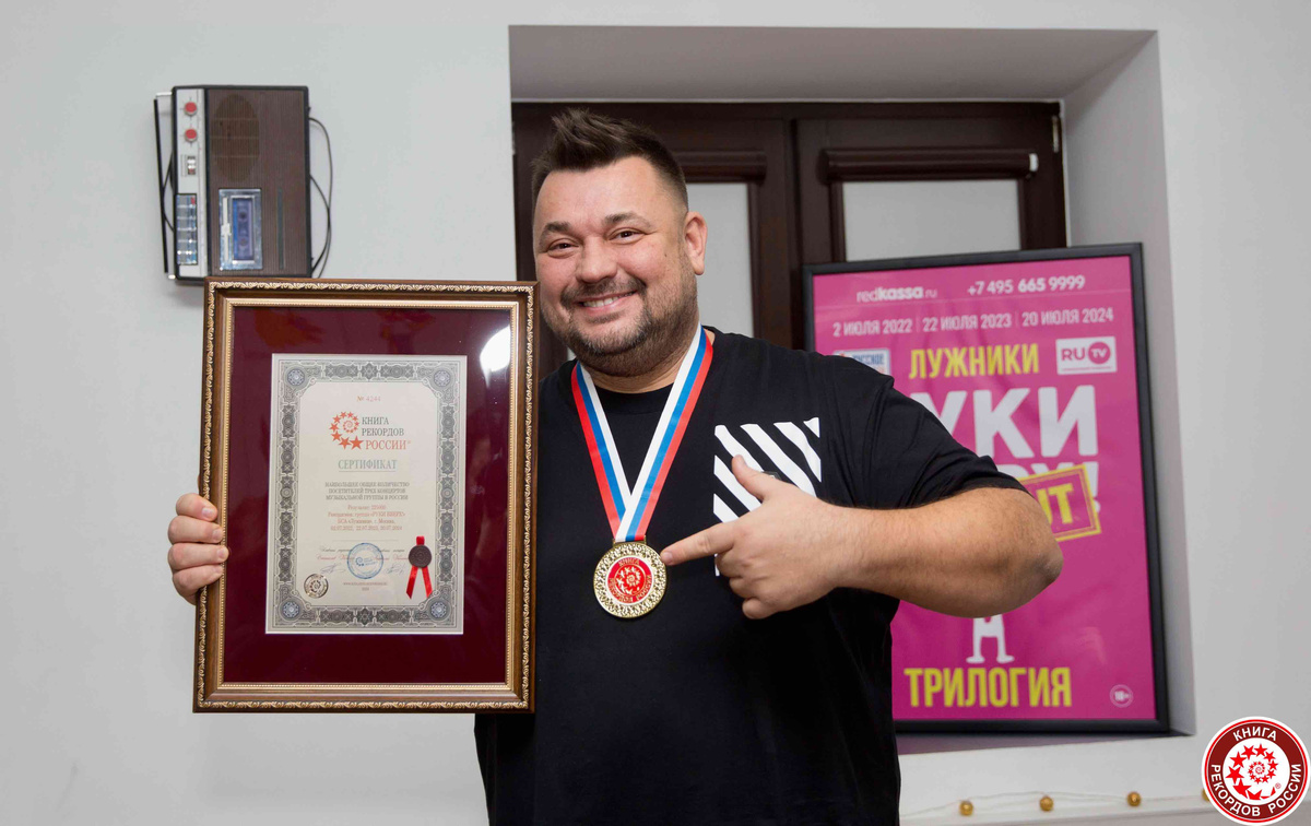 Группа «Руки вверх!» установила новый рекорд в России, собрав на трех своих концертах непревзойденное количество зрителей — 225 тысяч человек. Сергей Жуков 27 декабря получил сертификат Книги рекордов России. Он вспомнил, как в детстве мечтал о том, чтобы создать аншлаг на стадионе, и даже не думал, что сможет осуществить свою мечту сразу в трех городах. Музыкант заметил, что число зрителей, которые пришли на концерты, почти столь же велико, как население его родного города Димитровграда. Результат: 225000 Рекордсмен: группа «РУКИ ВВЕРХ!» Место: БСА «Лужники», г. Москва 02.07.2022, 22.07.2023, 20.07.2024