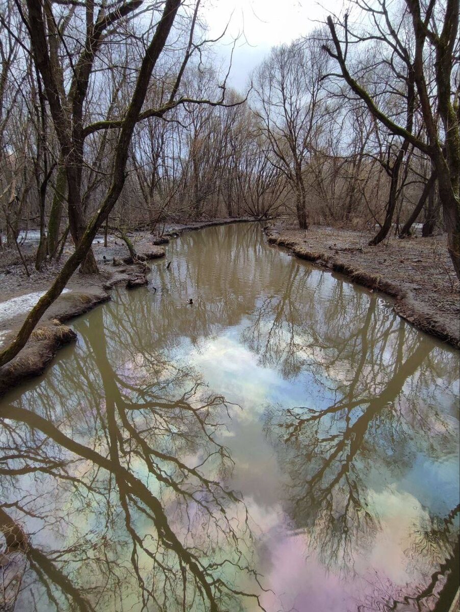 Радужные пятна появились на поверхности реки Чермянки в московском районе Свиблово