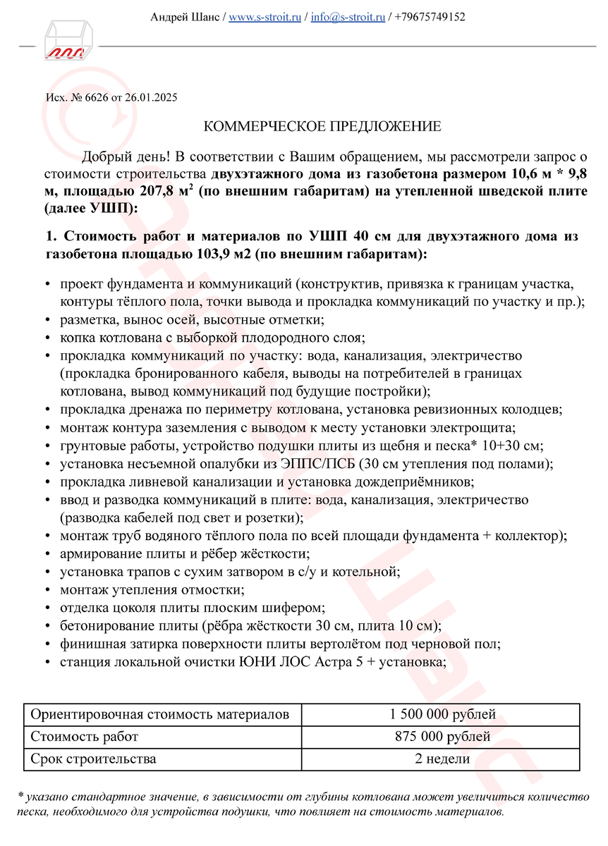 Актуальный пример КП на строительство двухэтажного дома из газобетона площадью 208 м2. Площадь считается по внешним габаритам, фундамент 103,9 м2 ✖️ 2 этажа = 207,8 м2. Обратите внимание, что в расчёт не входит крыльцо и терраса, изначальный запрос заказчика не включал эти конструкции. Иногда так бывает, хотя чаще отказываются от террас, а крыльцо при входе делаем почти всегда. Так или иначе, отсутствие в расчёте крыльца не сильно влияет на итоговую сумму. Прошу обратить внимание не только на строчку "итого", а на состав работ, перечисленных в тексте КП. На выходе мы предлагаем готовый дом, у которого есть полностью законченный фасад, окна, входные двери, все необходимые коммуникации внутри, включая электрику, инженерную сантехнику, отопление тёплыми полами на обоих этажах, готовую котельную со всем необходимым оборудованием. Стены дома подготовлены к чистовой отделке, поверхность пола подходит для укладки плитки или ламината. В мире квартир такое состояние объекта ещё называют Whit