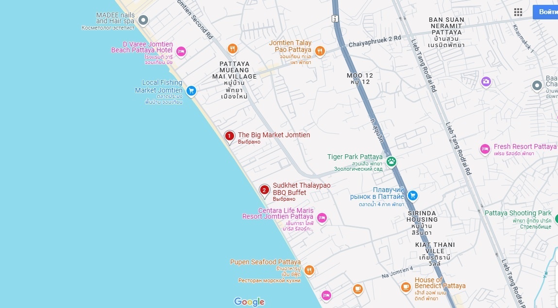 The Big Market Jomtien – один из трёх ночных рынков на Джомтьене в Паттайе. От центра он самый дальний, но это не затрудняет путь к нему. Время в пути м.б. от 25 минут без пробок до 1,5 час с пробками на дорогах. Он располагается прямо на набережной Джомтьена по которой ходит маршрутное такси — сонг тэо — то же, которое проезжает мимо рынка с Мельницей (ссылка здесь) и рынка с Маяком (ссылка здесь). Отправляется сонг тэо (где они пустые «загружаются» пассажирами) почти на пересечении Second Rd центра и Южной улицы, в 200 м от входа на Walking Street. Готовиться к остановке нужно после того, как вначале слева от дороги проедете высотку красивого белоснежного полукруглого отеля D’Varee с золотистой башенкой, затем справа проезжаете Local Fishing Market (утренний рыбный рынок) – прямо на берегу на протяжении 100-150 м стоят рыбацкие лодки и бежевого цвета полицейский участок напротив развилки дорог. Далее ориентиром будут служить сверкающие цифры ресторана 1669 видные издалека и рядом 7/E