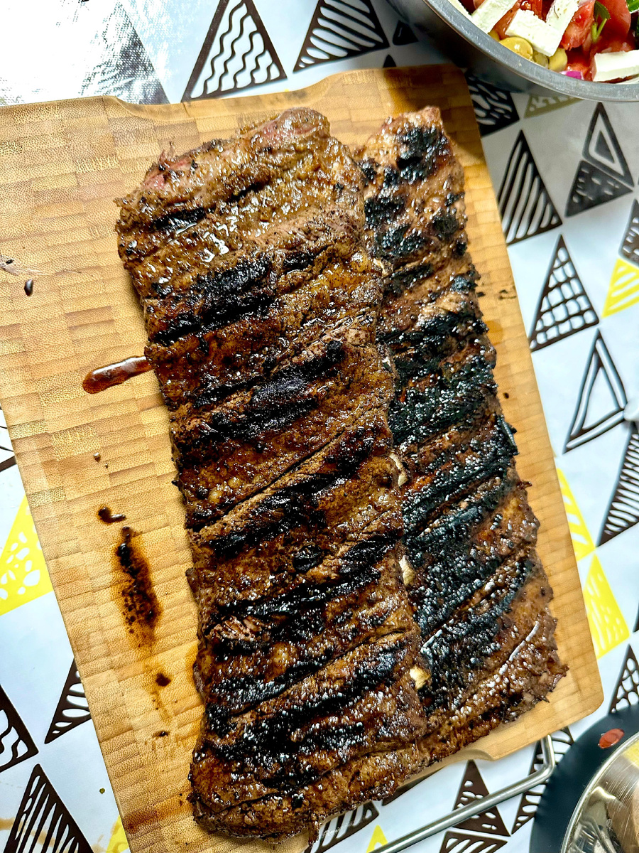 - выкладываем мясо на гриль доску и жарим! Доску перед этим надо нагреть на углях! При огне мясо будет гореть! Мясо переворачиваем каждые 3-5 минут в зависимости от интенсивности жара! Я смазал ребра соусом с медом в конце приготовления, что бы мясо не горело!