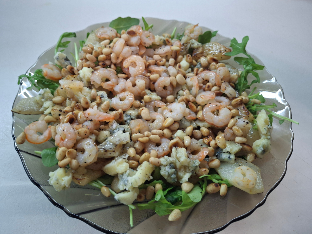 Салат с жаренной грушей, креветками, рукколой, кедровыми орешками и сыром Дор Брю…Ну если изощряться, то по полной…