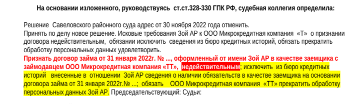 Решение Савеловского районного суда адрес от 30 ноября 2022 года отменить. Принять по делу новое решение. Исковые требования Зой АР к ООО Микрокредитная компания «Т» о признании договора недействительным, обязании исключить сведения из бюро кредитных историй, обязать прекратить обработку персональных данных удовлетворить. Признать договор займа от 31 января 2022г. № ..., оформленный от имени Зой АР в качестве заемщика с займодавцем ООО Микрокредитная компания «ТТ», недействительным ; исключить из бюро кредитных историй внесенные в отношении Зой АР сведения о наличии обязательств в качестве заемщика на основании договора займа от 31 января 2022г.№ ...; обязать ООО Микрокредитная компания «ТТ» прекратить обработку персональных данных Зой АР. Председательствующий: Судьи: ИСТОЧНИК: САЙТ МОСКОВСКОГО ГОРОДСКОГО СУДА