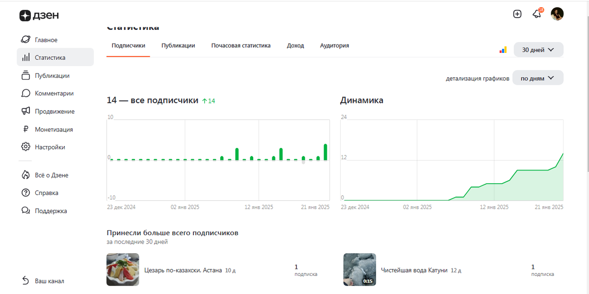 Делаем шаги в развитии канала на Дзен. Что сегодня? 13.01.2025 Хочу все бросить. Естественное желание новичка. День 5 (14.01.2025) Медленно, но верно. день 6 (15.01.2025) Дизлайк. Зачем ставят и как реагировать? день 9 (18.01.2025) Ну вот и случилось событие которого ждут все новички на Дзен. Очередной этап пройдет. Первые статьи написаны, видео выложены. Наконец-то набраны первые 10 подписчиков и Дзен начал рекомендовать канал. Мой канал вышел в рекомендации вчера вечером и это сразу отразилось на просмотрах. Сейчас расскажу выводы, которые я сделала на основании свой статистики. У меня больше всего рекомендаций было в роликах. Показов статей было на порядок меньше. Огорчает, что нет подписок от показов, значит что-то пошло не так и контент создан был не вовлекающий. Но исправить ничего нельзя, имеет то, что имеем на данный момент. А учитывая, что это мой первый опыт стабильного и целенаправленного ведения соц.сети, то я себе это с удовольствием прощаю))) Статистика по времени пр