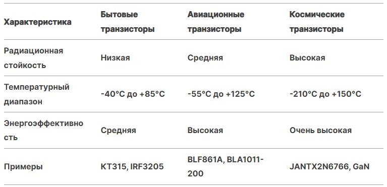 На нашем канале ранее уже была опубликована статья о применении полупроводников в космической отрасли: В этой новости мы не стали углубляться в технические детали проблемы. Чтобы предоставить вам более полную информацию о технических аспектах, мы подготовили дополнительный материал. Транзисторы — это ключевые компоненты современной электроники, которые выполняют две основные функции: усиление сигналов и коммутация электрических цепей. Их изобретение в середине XX века стало настоящей революцией, заменив громоздкие вакуумные лампы и открыв путь к миниатюризации электронных устройств. Сегодня транзисторы используются повсеместно: от бытовой техники до авионики и космических аппаратов. В этой статье мы рассмотрим, как транзисторы адаптируются для работы в различных условиях, и приведем конкретные примеры их применения. В бытовой электронике транзисторы используются для управления и усиления сигналов в устройствах, таких как телевизоры, стиральные машины, микроволновые печи и смартфоны. На