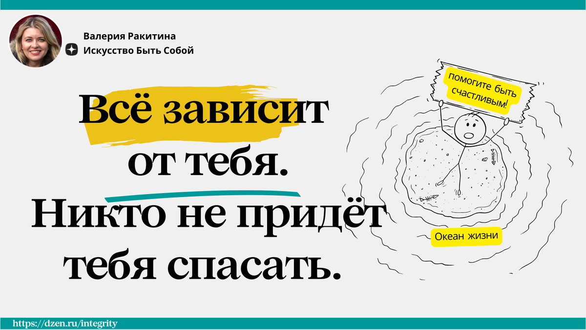 Может быть, это не то, что хочется услышать, но правда проста: никто не придёт тебя спасать. Никто не решит за тебя твои проблемы, не изменит твои убеждения, не даст тебе всё, о чём ты мечтаешь. Всё зависит только от тебя. Но в этом скрыта невероятная сила. Эта мысль может стать твоим ключом к свободе, потому что, как только ты поймёшь, что ты сам хозяин своей жизни, ты перестанешь ждать, начнёшь действовать и увидишь, как шаг за шагом твои мечты становятся реальностью. Очень легко попасть в ловушку ожиданий. Мы надеемся, что нас спасёт обстоятельство или человек: родители, друзья, партнёры, начальники, правительство. Мы ждём, что кто-то «придёт и исправит» — даст мотивацию, подарит возможность, откроет дверь. Но это иллюзия. Никто, кроме тебя, не может взять ответственность за твою жизнь. Люди могут помочь, но только ты способен менять свою реальность. Эта мысль может быть страшной — ведь ты больше не можешь обвинять кого-то другого. Но это и освобождает: ты не зависишь от внешних обс