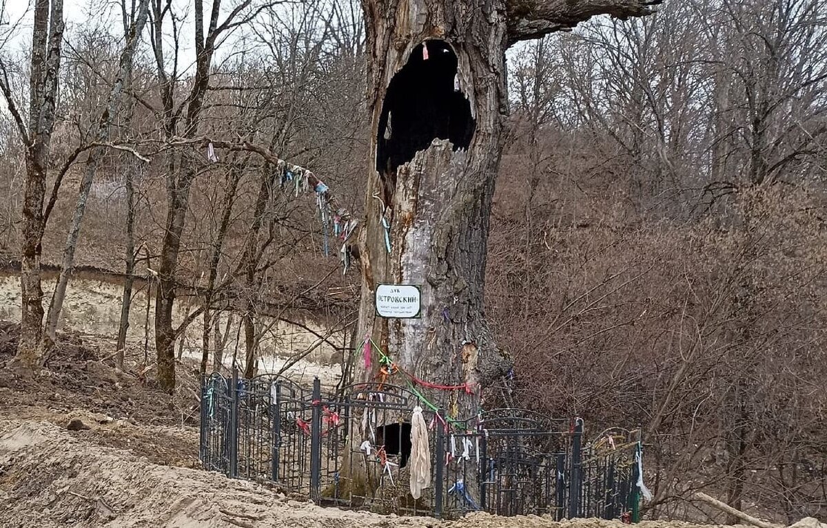 Когда-то Петровский дуб горел изнутри, поймав разряд молнии. После его осмотрели специалисты, которые залечили раны ствола, зацементировали огромное дупло и установили вокруг великана ограду. А еще они обновили знак особой заповедности дерева. Тот самый, на который теперь всем до одного места – и это не голова.