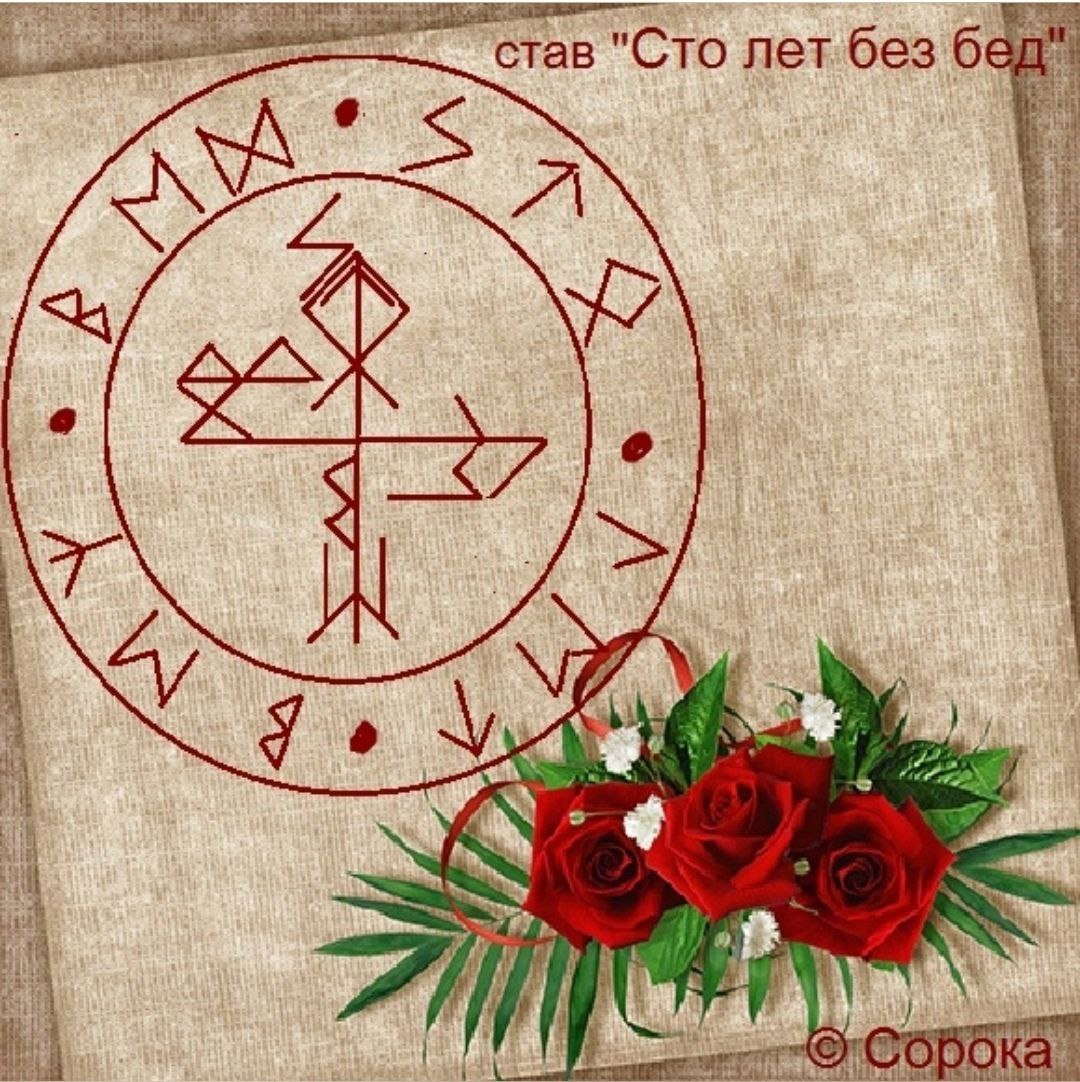 Известно, что любовь слово, написанное рунами, становится амулетом, оберегом, носителем энергии этого слова. Даже ваше имя, написанное рунами, является самым лучшим амулетом для вас. Этим принципом воспользовался рунолог Сорока, создав став-подарок "Сто лет без бед". В кольце рунами написана фраза "Сто лет без бед". Каждая ветвь става являет собой вязь отдельного слова этой фразы. точка - разграничитель. ✨Верх - Соулу, Тейваз, Одал - сто. ✨Справа - Лагуз, Эваз, Тейваз - лет. ✨Снизу - Беркана, Эваз, Альгиз - без. ✨Слева - Беркана, Эваз, Дагаз - бед. Данный став-подарок является пожеланием всего самого наилучшего. Как вы его оформите, зависит только от вашей фантазии. Хотите, сделайте в виде открытки, а хотите - вышейте, картину нарисуйте и в рамку. Знаете, есть такие картины, когда на холсте отпечатки ладоней ставят - вот, прекрасное место, сразу соединяется с чистой энергией получателя. Ну в общем, все на ваше усмотрение. Никаких оговоров и активаций. Сделали - подарили с намерением и