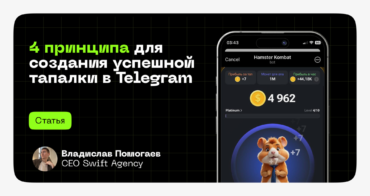 Привет! Меня зовут Влад и я основатель IT-компании swiftagency.ru. Большая часть запросов к нам - разработка Telegram игр. Мы создали 4 тапалки, а также я изучил 15 самых популярных игр в Telegram, чтобы выявить секреты их популярности, которыми я сейчас поделюсь. Тапалки, они же криптокликеры – это жанр игр, в которых основной игровой процесс заключается в многократном нажатии на экран. Игроки зарабатывают внутриигровые валюты, выполняя простые действия. Эта механика позволяет не только развлечься, но и заработать. 📌 С начала 2024 года тапалки, такие как Hamster Kombat и Notcoin, набрали огромную популярность. Миллионы пользователей погружаются в эти игры, привлеченные возможностью заработка и простотой игрового процесса. Одними из самых ярких представителей тапалок являются Hamster Kombat, Notcoin и Blum. Если ты планируешь создать свою Web3 игру в Telegram, важно продумать "Roadmap" проекта, то есть дорожную карту. Продумай, шаги проекта в будущем и какую ценность получит пользоват