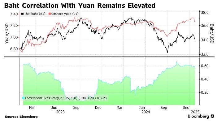 Перспективы бата зависят от поведения китайского юаня, поскольку между этими валютами существует корреляция около 0,56. Это означает, что они движутся в одном направлении.