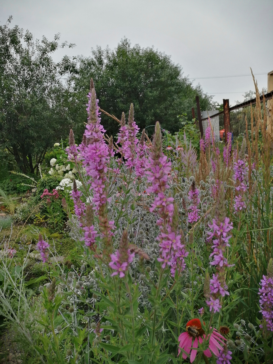 Кроме эхинацеи, есть еще три растения, которые намеренно разбросаны по цветнику с повторами. 2. Дербенник иволистный видовой. Выращен из семян. Я все хочу подселить к нему что-нибудь сортовое, но искомые сорта (хочу Свирл, Блаш и Роберт Компакта) мне не попадаются. Заказывать издалека не планирую, да и вообще я с этим уже никуда не тороплюсь - попадутся, куплю, нет - да и беды столько же, мне и так растений в цветнике вполне достаточно. Теперь по порядку. Устойчивость у него, как ни странно, средняя. Да, я тоже удивилась, вроде бы растение считается бронебойным. Но у меня он стабильно выпадает каждый год, хотя бы по одному растению - то просто из зимы не вышел, то водяные полевки, заразы такие, корень сожрали. Так что в прошлом сезоне я взяла дело в свои руки и как следует его начеренковала. Вот тут он реально беспроблемен - все черенки дали корни просто в воде, нормально зацепились в грунте, а кто-то даже процвел в первом же сезоне. Рассадила где хотела, заодно опять слегка скоррек