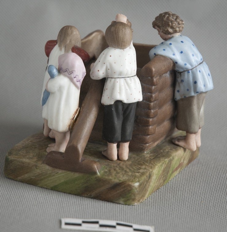 Вторая половина XIX века – время расцвета реализма, когда тема жизни и быта простого народа занимает ключевые позиции в произведениях искусства русских и европейских мастеров. Особенно, изображение в скульптурных композициях крестьянских детей и незатейливых сценок из их жизни. Скульптурная группа «Дети у колодца» была изготовлена на первой частной мануфактуре английского купца Ф.Я. Гарднера в 1880-90х годах. Группа крестьянских детей из четырёх человек пришла к колодцу в жаркий летний день, по-видимому, для того, чтобы достать оттуда прохладную воду. В их образах заключены те самые символы простоты и непосредственности крестьянского детства – голубая рубашка в горошек мальчика, лёгкие сарафанчики девочек, их распущенные волосы, босые ножки. Ребята опустили журавль с ведром в глубь колодца. По их лицам видно, насколько сильно дети увлечены процессом добычи воды. Другая маленькая девочка в косынке же стоит в стороне от своих товарищей, крепко прижав к себе куклу и не принимая участия в