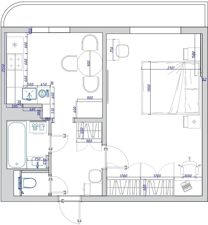 В короткие сроки и с минимальным бюджетом перед дизайнером Екатериной стояла задача преобразить типовую однокомнатную квартиру, которая изначально была непригодной для жизни, в готовый для продажи уютный и стильный объект. Важным этапом было создание визуально привлекательного и максимально функционального пространства, а также гармоничное включение модели радиаторов отопления КЗТО РС в интерьер. Делимся подробностями проекта! Помещение отличалось сложной планировкой: нестандартная геометрия, наличие нескольких выступов и выход на лоджию создавали дополнительные вызовы для дизайна. Для оптимального использования сложной геометрии кухни кухонную мебель изготовили на заказ, что позволило максимально эффективно задействовать пространство для хранения. В дополнение к стандартным элементам — встраиваемому холодильнику, посудомоечной машине шириной 45 см, духовому шкафу и многочисленным ящикам — были созданы удобные неглубокие зоны для хранения возле входа. Также на кухне установили готовый