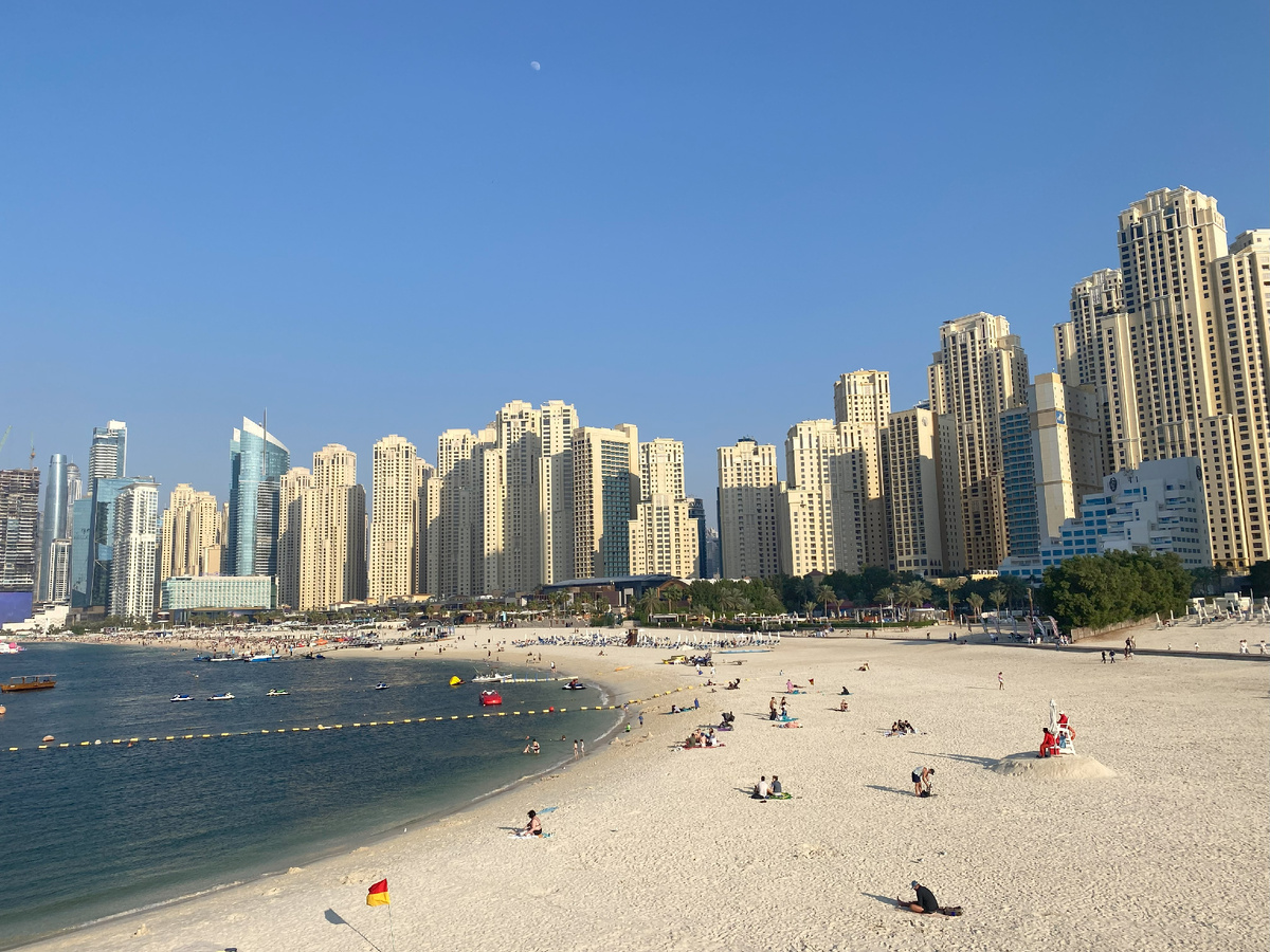 Находится недалеко от канала Дубай Марина. Добраться до него можно на такси или дойти пешком, если живете в соседнем небоскребе. Так же можно на метро, но потом пройти порядка 1.5 километра. Что в принципе тоже несложно пройти по красивейшему городу в мире. Где ультрасовременные здания будут вас впечатлять. С некоторых отелей ходит трансфер до Дубай Марина Бич. Оттуда до пляжа буквально 100 метров. Мы добирались от отеля Меркури на трансфере, до павильона бабушка. А когда не было трансфера, то на метро до станции, а оттуда пешком. Пляж оборудован специальными местами, где можно переодеться, сходить в туалет, помыться в душе. Но душ платный. Но не расстраивайтесь, рядом с ним находится кран где можно помыть ноги за бесплатно. Плюсы -до многих локаций, можно подать рукой. Колесо обозрения, парк блю вотерс, известные на весь мир. Так же вся тусовка, крутые магазины и автомобили находятся буквально в 100 метрах от вас. Зимой вода здесь на градус два теплей, чем в других местах. Белы
