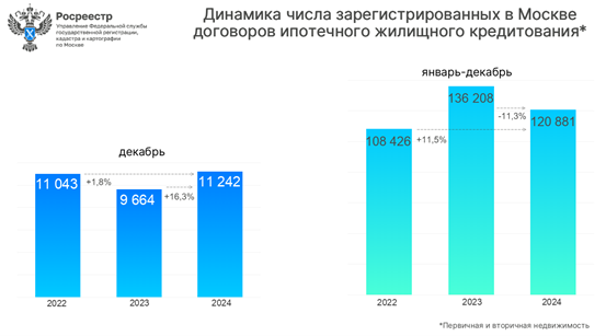 Таким образом, динамика к аналогичному показателю рекордного 2023 года (136208) составила 11,3%, а к 2022-му (108426) число ипотечных договоров при покупке жилья выросло на 11,5%. «Объем выданных кредитов с господдержкой в 2024 году составил 618,9 млрд руб. – это 19,3% от общероссийского уровня льготных ипотечных средств. Всего в столице за все время действия программ выдано займов на сумму 2,7 трлн руб.», – сообщил заместитель мэра Москвы по вопросам градостроительной политики и строительства Владимир Ефимов. В декабре прошлого года столичное Управление Росреестра оформило 11242 ипотечных кредита. Показатель вырос за месяц на 27,1% (8846 договоров в ноябре 2024-го). Положительная динамика отмечается и в годовом отношении: к декабрю 2023 года (9664) рост на 16,3%, а к аналогичному месяцу 2022-го (11043) – на 1,8%. Руководитель Управления Росреестра по Москве Игорь Майданов отметил, что ипотечный рынок столицы в последний месяц 2024 года продемонстрировал уверенный рост показателей и к