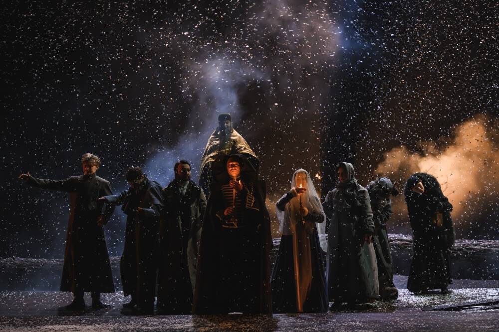 На сцене, визуально очень простой – широкое, приподнятое к горизонту, открытое пространство с тремя вековыми соснами, но технически сложной, начиненной оборудованием для создания кинематографичной «картинки» природных стихий, представлены истории, описанные А. С. Пушкиным, на фоне четырех времен года – весна, осень, зима и снова весна как символ возрождения.