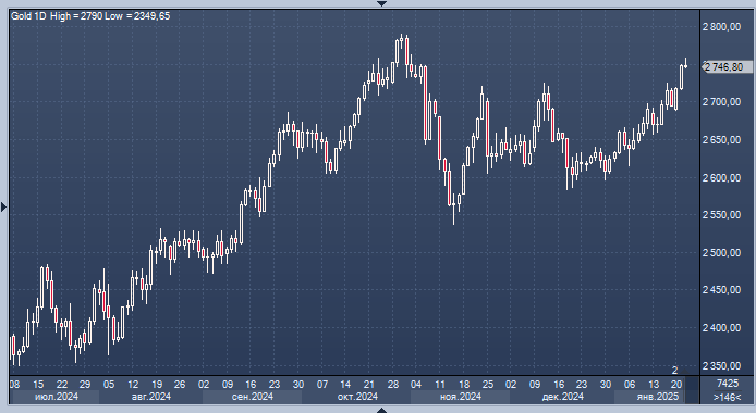 Трамп обещает ввести торговые пошлины против ЕС. Золото достигло самого высокого уровня с ноября 2024 года. ФРС, скорее всего, сохранит ставки на прежнем уровне на следующей неделе. ANZ ожидает увеличение инвестспроса на золото График цены наличного золота интервалом свечи в 1 день В среду стоимость золота достигла 11-недельного максимума, что близко к историческому пику, который был зафиксирован в прошлом году. Это произошло из-за спроса на безопасные активы, вызванного неопределённостью в торговой политике президента США Дональда Трампа и ослаблением доллара. На 05:02 по Гринвичу спотовое золото выросло на 0,3% до $2 751,89 за унцию. Ранее в ходе сессии оно достигло своего максимального значения с 1 ноября и приблизилось к рекордному максимуму в $2 790,15, который был зафиксирован в октябре. Фьючерсы на золото в США также выросли на 0,3% до $2 768,40. Кельвин Вонг, старший аналитик рынка OANDA по Азиатско-Тихоокеанскому региону, отметил, что пока неясно, когда Трамп начнёт реализовыв