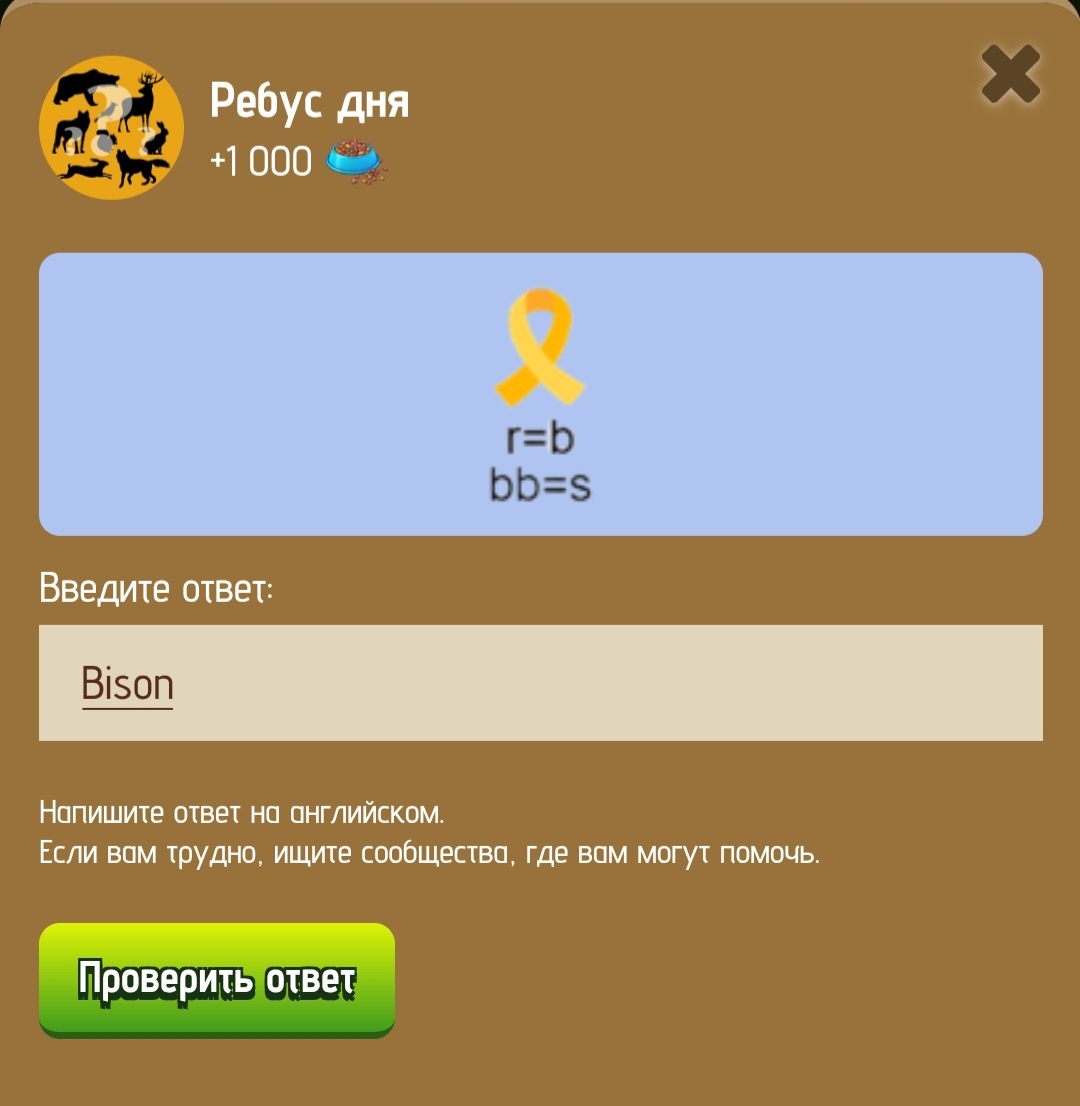Ребус дня в ZOO от 22 января 2025 Ответ: Bison Расписания подарочных коробок выкладываем регулярно в нашем телеграм канале - ТУТ Ответы на загадки и ребусы нужно вводить в разделе "Задания". Zoo - это игра, где нужно развивать свой зоопарк и собирать игровые монеты. Улучшаем животных, вступаем в альянс и выполняем задания.