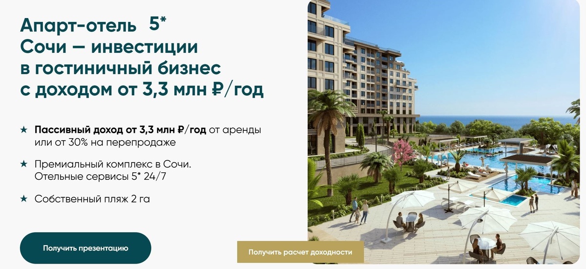 На черноморском побережье, в Крыму, в Сочи всё забито предложениями инвестировать или стать соинвестором в отеле. Пример на картинке вверху, название специально убрали, чтобы не рекламировать развод, но суть аналогичная у всех. Захотелось поизучать этот вопрос с целью банального сравнения инвестиционной целесообразности, скажем, с тем же рынком ценных бумаг...