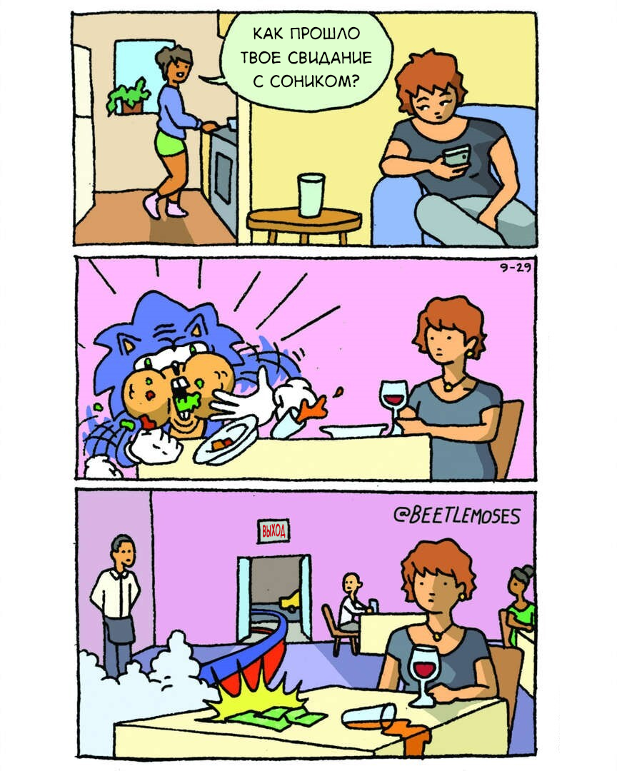 Еж Соник является одним из самых известных и узнаваемых героев видеоигр, а также официальным маскотом компании Sega. Созданный как конкурент Марио, синий еж в итоге стал центральным персонажем огромной медиафраншизы, которая включает в себя видеоигры, кино, мультфильмы и комиксы. А еще Сонику часто посвящают фанатское творчество - к примеру, юмористические веб-стрипы. Несколько подобных сюжетов собраны в этой статье. Надеюсь, что вам понравится! Одна из главных способностей Ежа Соника - это его невероятная скорость. Американский художник Харрис Фишмен (Harris Fishman) - автор серии Beetle Moses («Жук Моисей») - в своих комиксах часто отсылается к видеоигровым персонажам и в одной из таких зарисовок он решил пофантазировать о том, как особенности Соника могли бы влиять на его повседневную жизнь. В большинстве видеоигр про Соника синий еж занимается сбором золотых колец - они нужны, чтобы он не погибал при получении урона. Если кольца собраны, то вместо смерти Соник просто их теряет. Худ