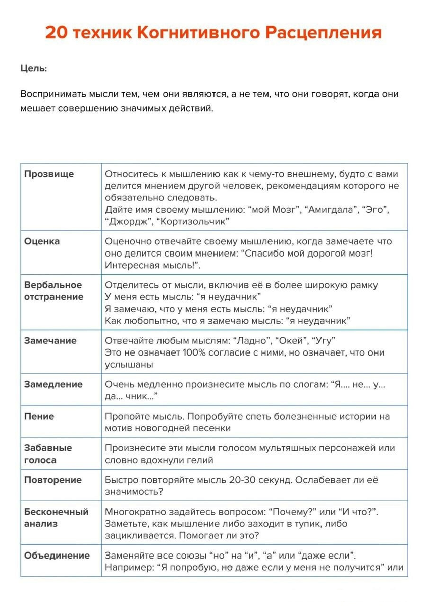 5. Заменять на положительные мысли АСТ-терапия исходит из того, что проблема не в самих негативных мыслях, а в том, что мы на них зацикливаемся и, в конечном итоге, застреваем. Альтернативой в борьбе с мыслями, которая в долгосрочном периоде лишь усиливает нашу зацикленность на них — это изменение отношения к ним через технику «когнитивное расцепление". Смотрите техники когнитивного расцепления в картинках ниже. И приглашаю Вас на мои консультации, где я помогу Вам освободиться от негативных мыслей, тревоги и страхов!