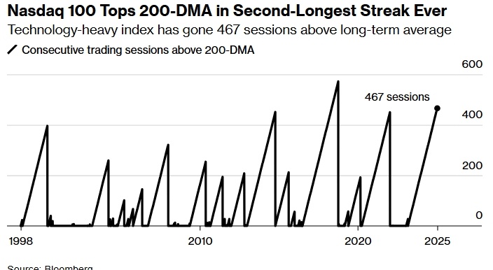 Nasdaq 100 превысил 200-DMA во второй по продолжительности серии за всю историю. Индекс, ориентированный на высокие технологии, поднялся на 467 сессий выше долгосрочного среднего значения. Источник: Bloomberg