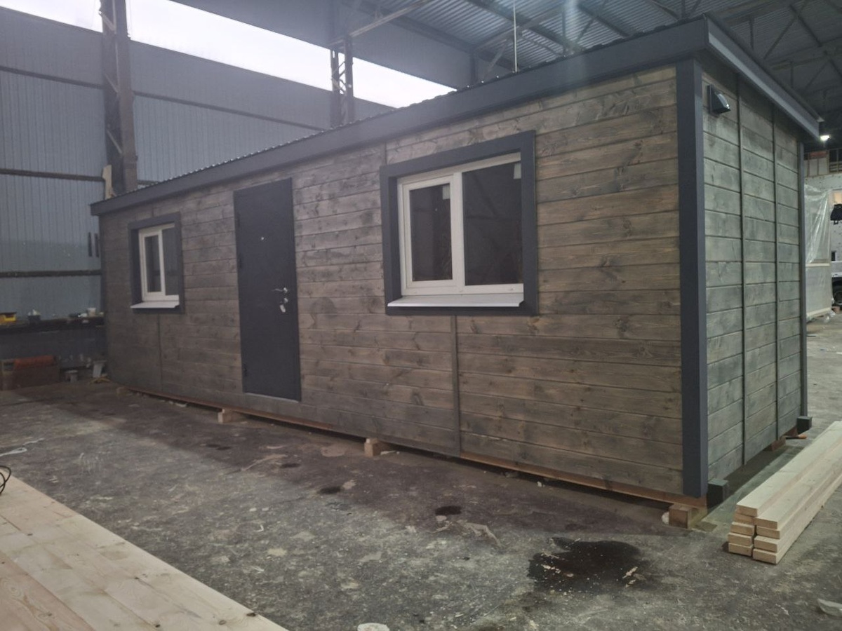 №47 Распашонка 8х2.3м с помещением под санузел СУПЕРХИТ Комплектация «Комфорт» с изменениями: Габариты: Внешний размер бытовки 780х230см, высота потолка внутри помещения 210-200см. Каркас: 100х30мм Отделка короткая: Имитация бруса снаружи и внутри. Полы короткие: Черновой пол вагонка. Чистовой пол шпунтованная доска 28мм. Утепление (пол, стены, потолок): Мин. вата рулонная 100мм + мембрана Изолар А и В. Вентиляция: Точки пассивной вентиляции 3шт. Окна: Белые пластиковые поворотно-откидные окна 120х90 (2шт) с белыми отливами. Двери: Входная дверь металлическая пр-ва РФ, отделка внутри металл. Межкомнатные двери каркасные из бруска и обшитые вагонкой с 2-х сторон с ручками. Кровля: Оцинкованный профлист С8. Обработка: Покраска внешних стен антисептиком с выделением наличников. Обработка чернового пола ОгнеБио. Покраска чистового пола антисептиком и лаком. Электрика: Разведена в каждом помещении внешняя в белом кабель-канале (выключатель-розетка + светодиодный плафон). Автомат. ЦЕНА: 539