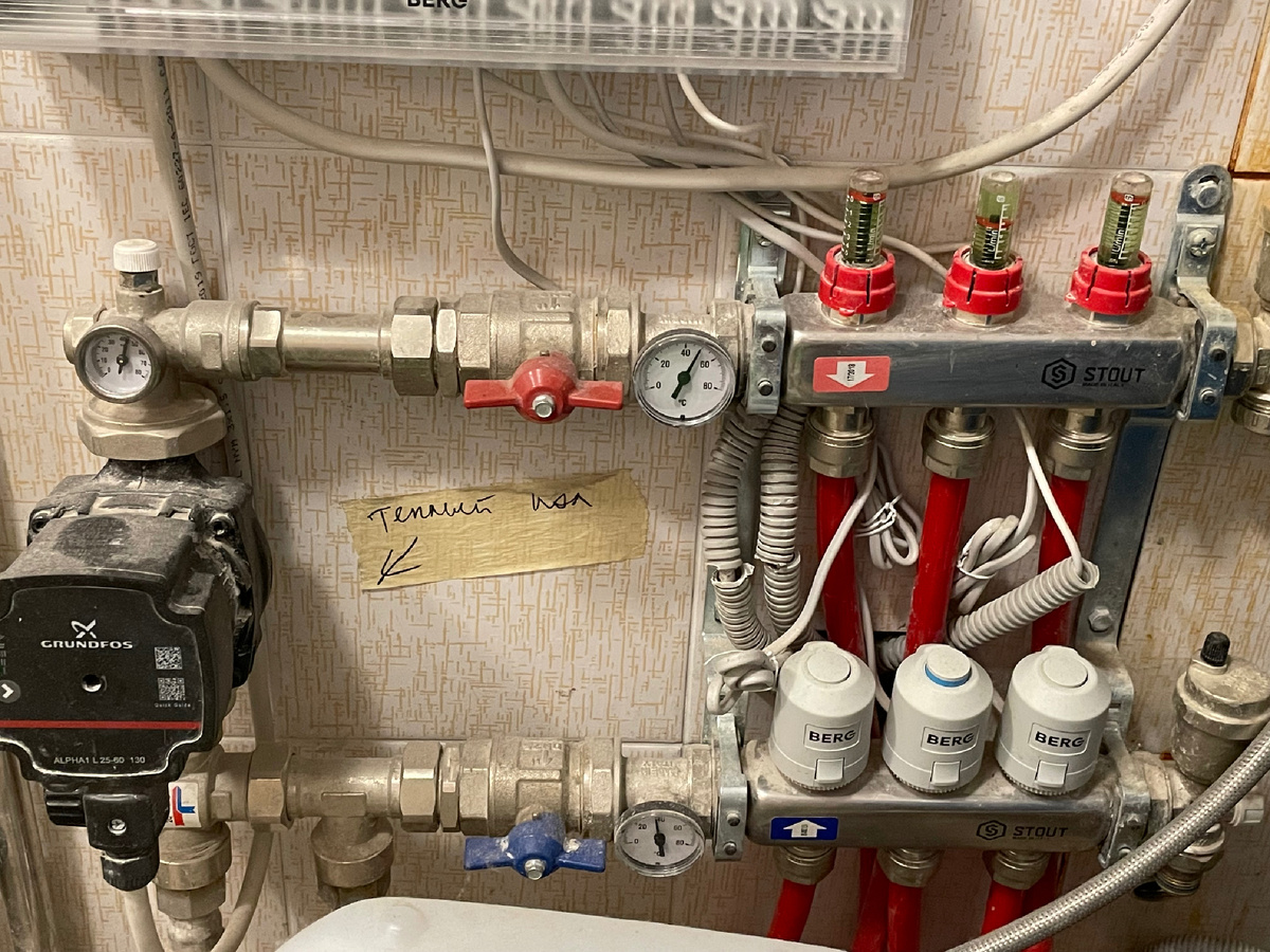 Если в городской квартире вполне можно обойтись без теплого пола, особенно если у вас паркет или ламинат, то в загородном доме теплый пол хотя бы на первом этаже просто необходим. Теплые полы бывают водяные и электрические. Казалось бы, все понятно. Но есть нюансы. Разберемся в деталях. Водяные полы так же бывают двух видов: собственно вода и антифриз. Вода, конечно, экологичнее и проще. Залил и гоняй ее туда-сюда. Но! Очень важно избегать промерзания дома. То есть все выключить и уехать на зиму в город не получится. Вода, как вы понимаете, замерзнет, и хана системе. Опять же, если у вас дом на сваях, зимой при сильных морозах вода может замерзать. Чтобы решить эту проблему, можно вместо воды залить антифриз. Он точно не замерзнет. Но, как говорится, есть нюанс. Он не бесплатный и раз в 5 лет его нужно менять. Я, кстати, планирую сделать эту процедуру где-нибудь в мае. Как раз и покажу, как происходит данный процесс. Помимо прочего, водяные полы добавляют веса прилично, и нагру