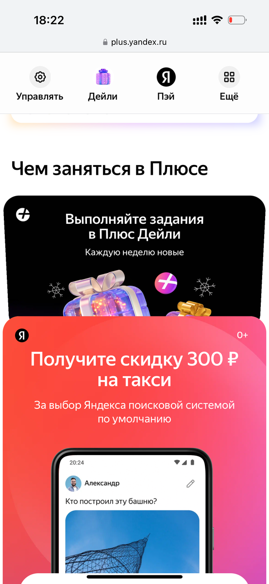 У Яндекса новая акция - 300 рублей за пару несложных действий :) Заходим в Яндекс Плюс, листаем до пункта - "чем заняться" и видим заветный баннер. Заходим туда и следуем инструкции - необходимо установить Яндекс Поиск основной системой Интернет поиска на телефоне. Придётся немного поковыряться в настройках, а в конце совершить поиск чего-либо через Яндекс. Дальше ждем в течение примерно 2 недель и забираем бесплатную поездку на такси! Я уже свою потратила/прокатилась :) Вариант 2 - получаем 300 рублей или 3000 апельсинок от Пятерочка/Перекресток. Заходим по ссылке. Далее алгоритм тот же, устанавливаем Яндекс поиск как основной, делаем не менее двух запросов в поисковике в течение 14 дней и вводим свой телефон, привязанный к карте Х5. Ждем 2 недели, а полученные бонусы тратим в течение еще 30 дней. Но, если у вас уже стоит Яндекс поиск, то, к сожалению, ничего не выйдет.