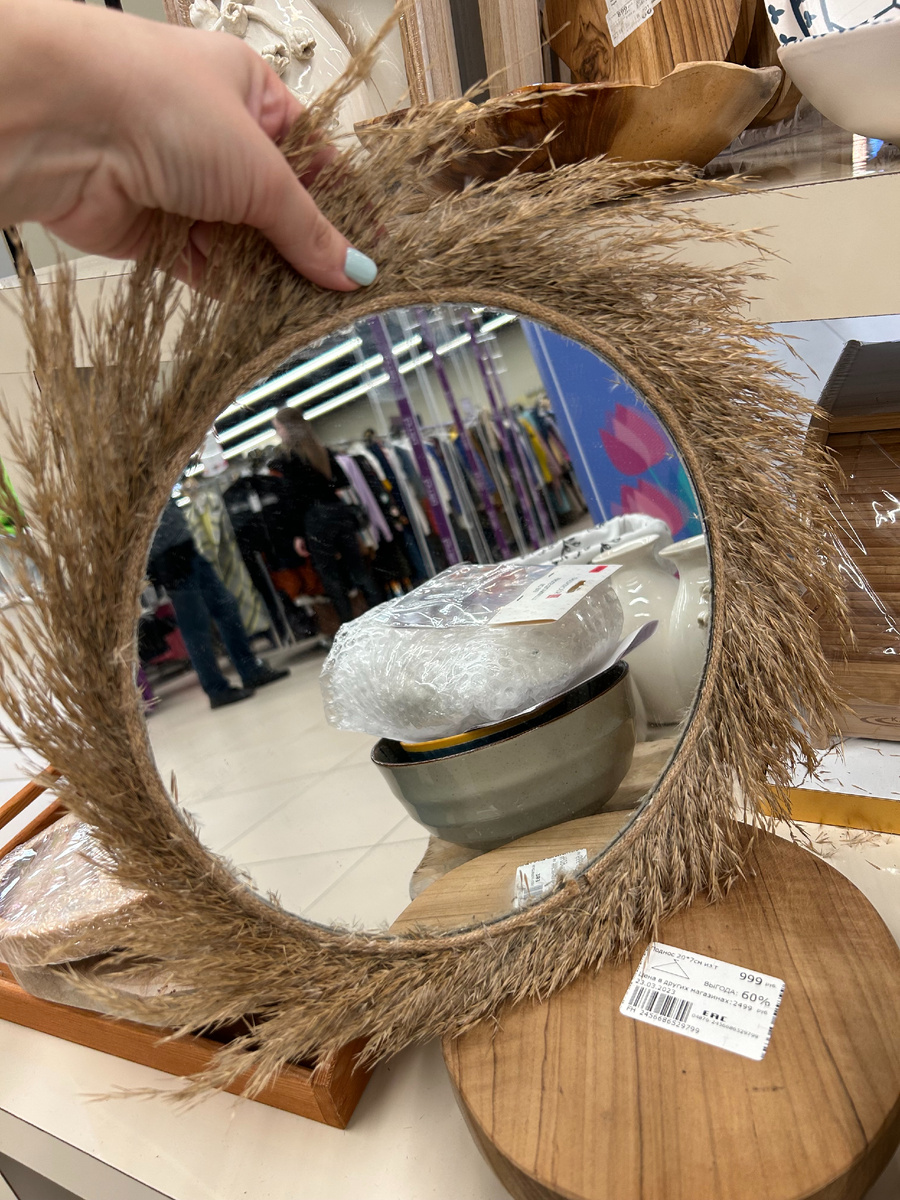 И подумала: "Раз эта ободранная травка столько стоит (уже не помню сколько), не сделать ли мне самой такое же, но симпатичней?!" Так и родилась идея моего нового предмета интерьера. Я купила круглую фанерку на Ozon. Обычно их покупают для изготовления настенных часов. Наконец приобрела себе клеевой пистолет и купила верёвку для подвеса в Лемана Про (тогда еще он был Леруа Мерлен). Конечно, понадобилось и само зеркало, которое я заказала на одном из маркетплэйсов. Как раз возвращаясь из путешествия, где-то в районе Ростова Великого я набрала огромный букет пушистой пампасной травы или как её официально называют кортадерии. В принципе, я думаю найти её в природе не проблема. Она любит мокрые болотистые местности и растет много где. Например, в парке под моими окнами или на даче. Или всегда есть более ненавязчивый вариант - купить на маркетплэйсе.