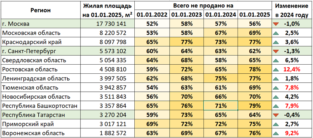 В связи со снижением спроса на новостройки происходит увеличение остатков непроданных площадей – как именно за 2024 г. увеличилась доля непроданных площадей, рассмотрим в таблице: Улучшение ситуации с непроданными запасами произошло только в Москве, Санкт-Петербурге и Республике Татарстан. Наиболее существенно в 2024 г. выросли запасы в: · Ростовской области – на 12,4%; · Воронежской области – на 9,2%; · Республике Башкортостан – на 7,9%; · Тюменской области – на 7,8%. Проблемными с точки зрения большого объема непроданных площадей на 01.01.2025 г. являются: · Республика Башкортостан – 79%; · Ростовская область – 78%; · Ленинградская область – 77%; · Краснодарский край – 77%; · Воронежская область – 76%; · Приморский край – 75%. Посмотреть, какой процент квартир не продан (при открытых продажах) в вашем регионе, можно бесплатно в телеграм-боте DomAnalyticsBot, в разделе «Данные по региону». А в DomAnalyticsInfo – больше актуальной аналитики по новостройкам РФ.