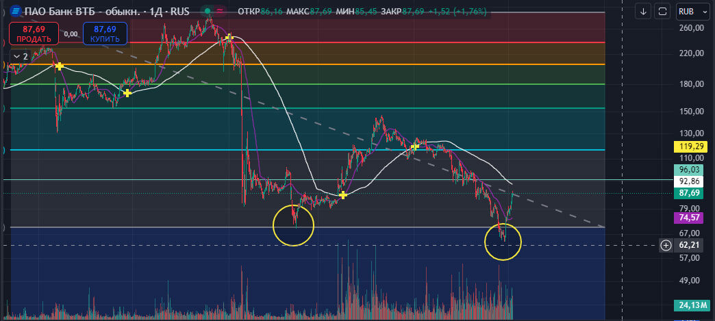 $VTBR 📉Тренд глобальный и краткосрочные нисходящие. 📊В данный момент цена корректируется так как Обновили предыдущий минимум и дошли до 63,35. Сопротивление 92,86, если пробьёт, то есть шанс дойти до 100 руб может быть даже чуть выше. ✅Повышение цены - это коррекция, маловероятно, что мы сменим тренд на восходящий, поэтому после коррекции увидим продолжение падения. В длительную позицию Я бы не стала заходить в лонг. НЕ ИИР #теханализ #инвестиции #втб