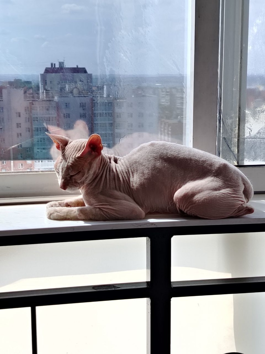 Кот у нас довольно оригинальный. Зовут его Кокос. Он сфинкс, хотя и не совсем лысый. Это велюровый сфинкс, то есть, все его тело покрыто тонким слоем подшерстка, очень приятного на ощупь. Мы его называем «наш кинестетический кот», потому что гладить его очень приятно – этакая игрушка-антистресс. Но дело в том, что он сам не относится к ласковым котикам, которые спокойно терпят и даже любят, когда хозяева их треплют, наглаживает. У него повышенная самооценка – он любит, чтобы его гладили только тогда, когда он сам этого захочет - придет и начнет требовать этого, толкая руку. А иначе может и куснуть. Ему уже 13 лет, и он заметно постарел. Но длинные лапы и общая поджарость остались. Раньше мы его за грациозность и необычность поз, когда он надолго застывал в одной позе и становился похожим на статуэтку, называли страшно красивым. Но сейчас слово «красивый» по отношению к нему в нашем обиходе пропало. Но хоть он постарел и пострашнел, мы его любим. А вот он нас… Если к внучке он какие