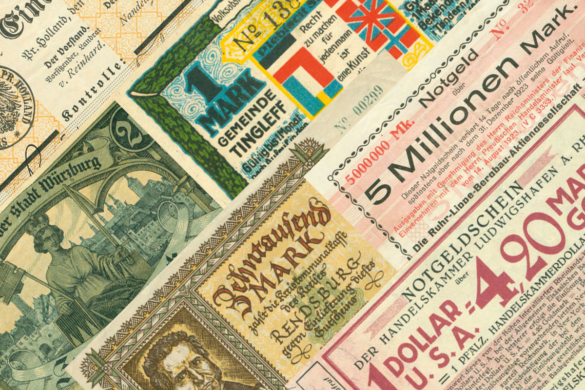 С июля 1923 года мы говорим о так называемом гиперинфляционном периоде, на долю которого приходится большая часть немецких денег на случай чрезвычайных ситуаций. Тогда в обращение поступали купюры в миллионных, миллиардных и даже триллионных номиналах. К сожалению, до сих пор нет каталога, пересмотренного в настоящее время, если не считать экстренных денег железных дорог и почты, для которых доступен текущий каталог немецких экстренных денег, том 13: Бумажные деньги немецких железных дорог и почтовой службы Рейха.