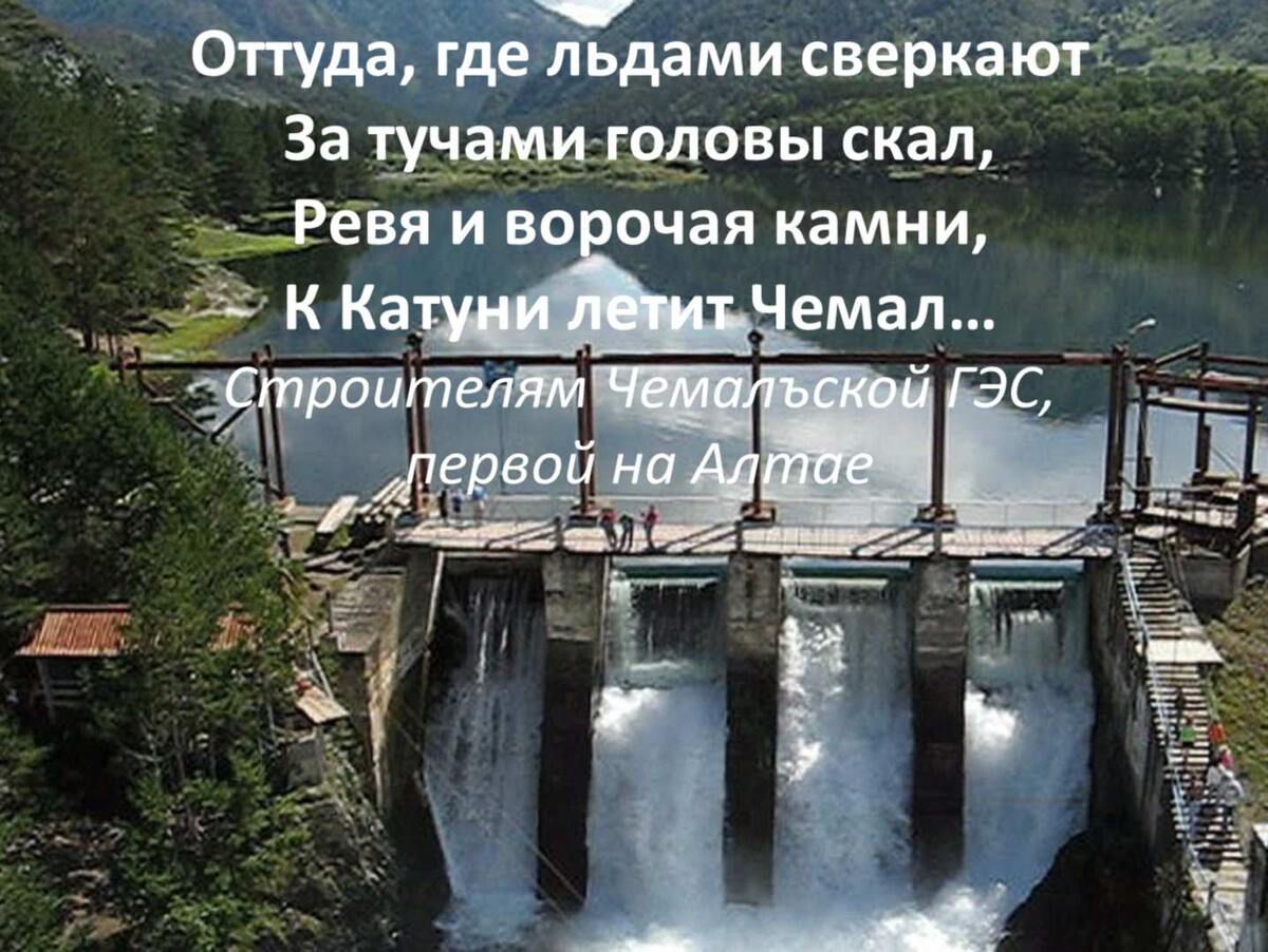 Чемальская ГЭС — гидроэлектростанция на реке Чемал в селе Чемал (41//188 км) (+1км от поворота). Построена в 1935 году, выведена из эксплуатации в 2011 году. Расположена в двухстах метров от места впадения реки Чемал в реку Катунь. Привлекает туристов своими красивыми видами на слияние рек Чемал и Катунь