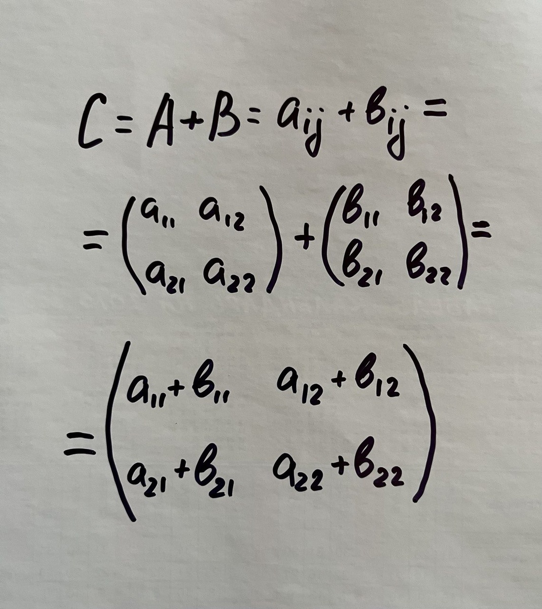 Сразу надо остановиться на важном моменте: складывать и вычитать можно только матрицы одинакового размера, то есть у таких матриц должно быть одинаковое количество строк и одинаковое количество столбцов. Начнём со сложения. Для нахождения суммы двух матриц нужно последовательно сложить элементы матриц, стоящие на одинаковых местах. Рассмотрим на примере для матрицы второго порядка: Для сложения матриц характерно следующее: Перемена мест слагаемых действует и при сложении матриц: А+В=В+А. При сложении трёх и более матриц, складывать их можно в любом порядке: А+В+С=С+А+В=В+С+А и так далее. Разберём сложение матриц на числовом примере: Мы последовательно сложили элементы матриц А и В и получили матрицу С, являющуюся суммой предыдущих. При вычитании матриц одинакового размера мы соответственно вычитаем из каждого элемента первой матрицы занимающий аналогичное место элемент второй матрицы. Рассмотрим на числовом примере: