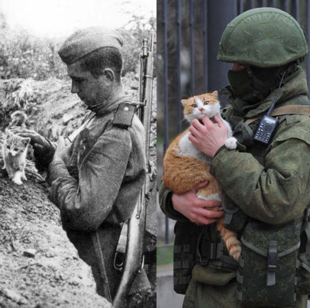 Там, где взрывы растут Как из дыма цветы Рядом с нами живут Фронтовые коты! И откуда они Там где горе и боль, Словно с неба сошли Души Ангелов, что ль! Только в каждый блиндаж, Где вселялся народ, Как божественный страж Заявлялся свой кот. Черный, серый, рябой Перепутать нельзя Есть на выбор - любой - Это наши друзья! Кот водительский - "Дрон" За Камазом лежит, Пока ближний его Под капотом торчит, "Тайсон" - черный, как ночь, На охоту ползет И пошли бы все прочь - Он в разведке живёт! "Рыжик", хитрый зело, По тропинке бежит! Кто хозяин его? Угадал! - Замполит! Самый толстый - штабной Не боится собак Светло-серый, стальной По прозванью "Черпак"! "Боцман" - страшный на вид, Разбегайся, народ, Громче всех он шипит И при кухне живёт!.. Если долго не спал, На душе маета, Если очень устал - Позови ты кота! Позови ты кота И он сразу придет, Словно скажет тогда -Ерунда, все пройдёт! В руку тыкнется лбом, Рядом ляжет, урча, Сразу вспомнишь свой дом И заснешь, как дитя. ❤️❤️ВМЕСТЕ МЫ СИЛА❤️❤️
